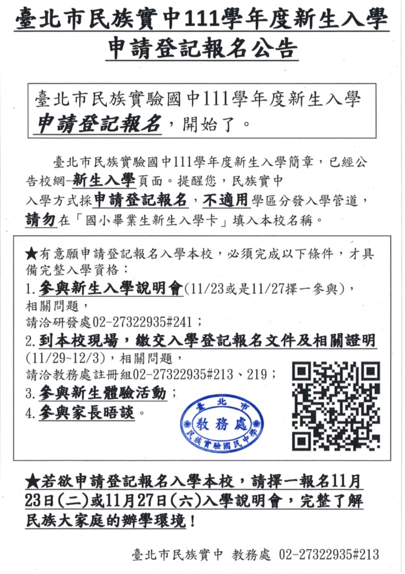 轉知-「臺北市民族實驗國民中學111學年度新生入學申請登記報名事宜」